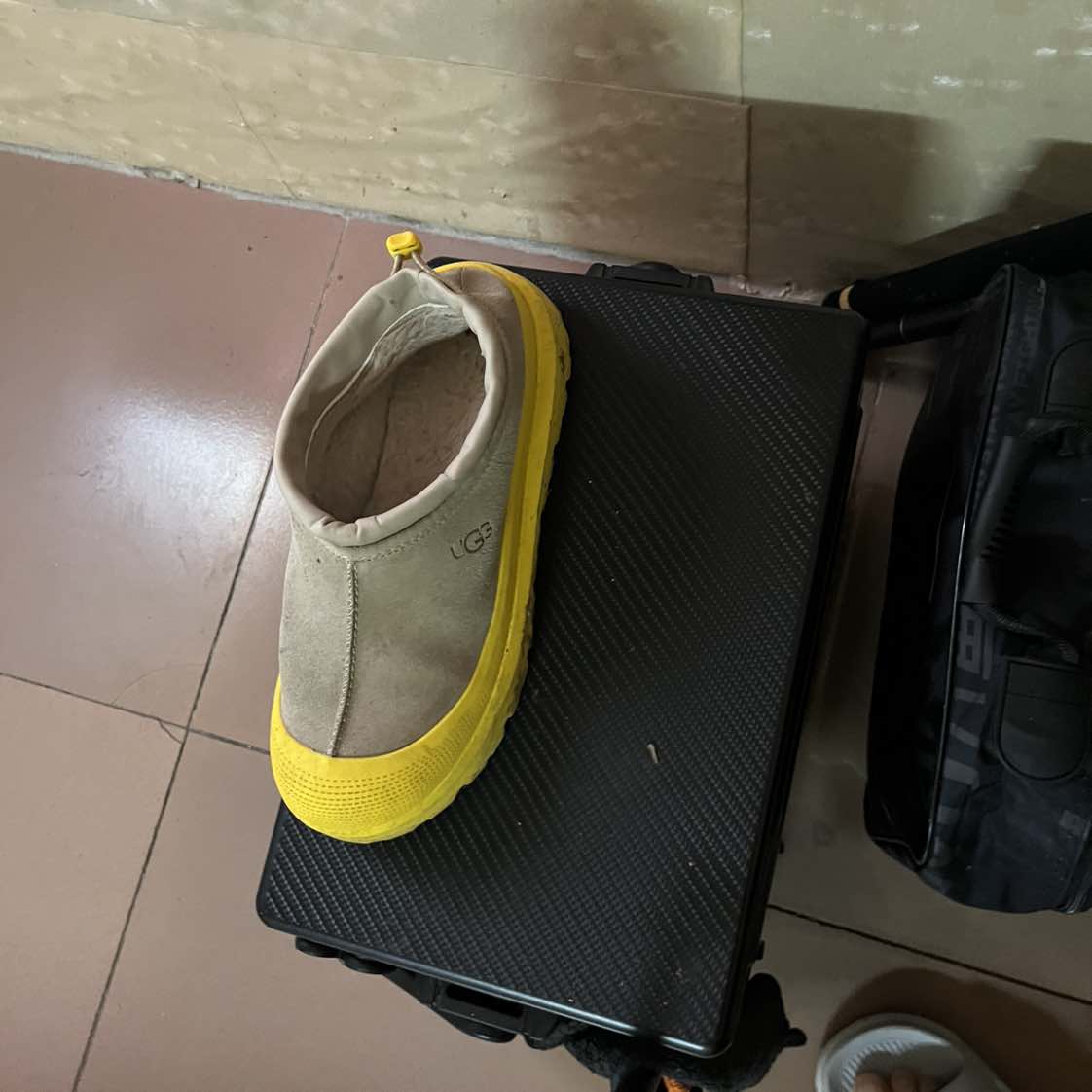 四十公分的钓箱和我的鞋子对比